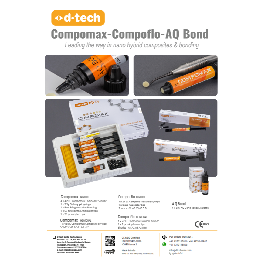 D Tech Dental Technologies presents Compomax, a premium light-curing nano-hybrid composite designed for reliable restorations in both anterior and posterior teeth. Developed with advanced nano-hybrid filler technology, Compomax offers an ideal combination of high strength, excellent aesthetics, and reduced polymerization shrinkage, ensuring durable and natural-looking restorations.